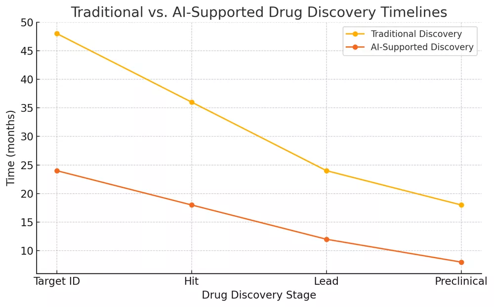 This line chart illustrates how AI-supported drug discovery dramatically shortens timelines compared to traditional methods.